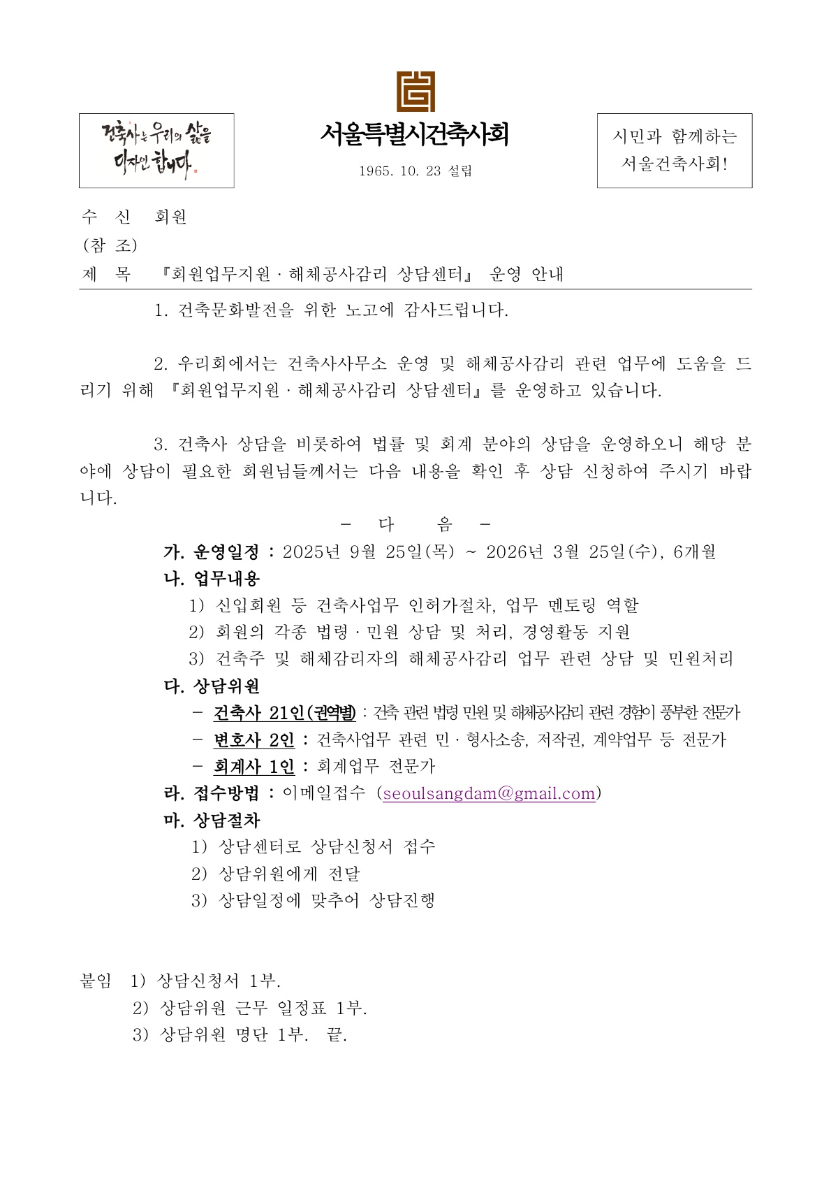 『회원업무지원 · 해체공사감리 상담센터』 운영 일정 안내(25.9.25~26.3.25)